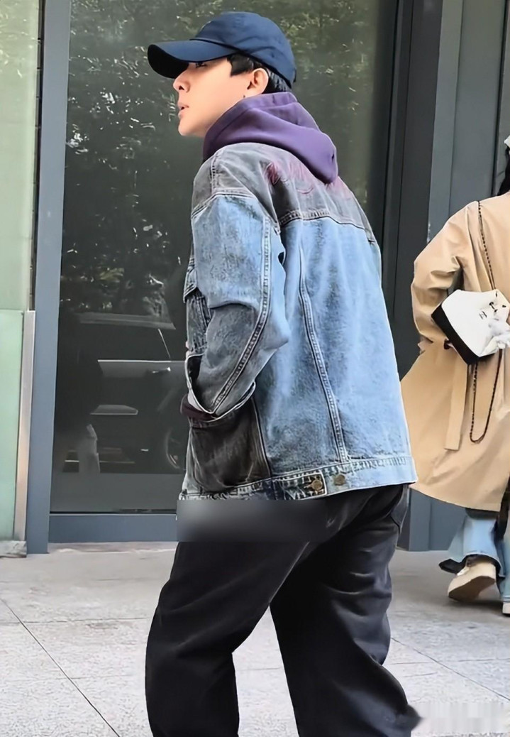 穿件紫色的连帽卫衣,头上戴着黑帽子,外面搭了件牛仔 T,领口露出一点边。