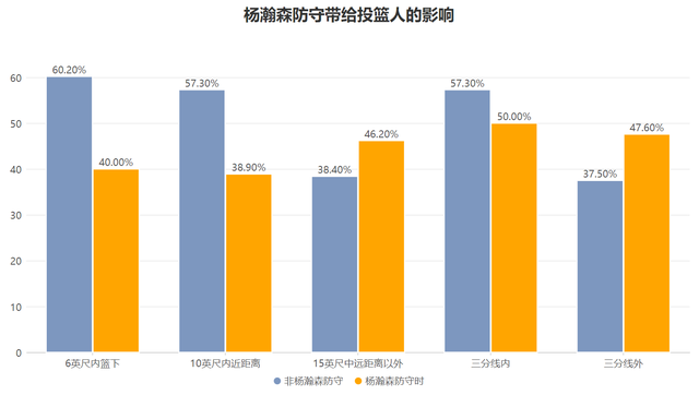 其三是杨瀚森防守端的问题,实际上杨瀚森并非没有防守的球员,在6英尺内的篮下与10英尺内的近距离区域,杨瀚森均能明显降低对手的命中率,但在15英尺中远距离以外以及三分线外他也会令对手的命中率飙升,这意味着他的防守只在距离篮筐较劲时才是正面贡献,但由于运动能力不足他换防外线时会陷入极度挣扎的状态,不上前就等于放对手投篮,上前就会被对手一步过掉。
