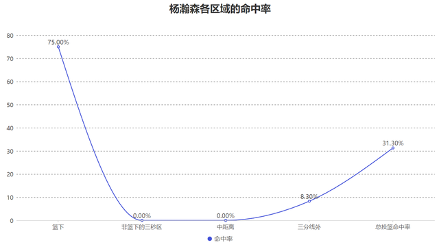 造成在场负面作用的原因主要有三,其一是杨瀚森的终结能力。杨瀚森本赛季的罚球命中率达到了87.5%,这意味着当处于无人干扰时杨瀚森有着稳定的得分能力,而一旦在运动战他在跑动或对抗后的命中率会低到令人发指的程度,但若是距离篮筐更近他可以通过对抗后完成得分,在篮下区域杨瀚森目前12次出手命中9球命中率达到75%,而在非篮下三秒区以及中距离他的命中率为零,这些可以表明杨瀚森在进攻端只有在篮下才能有较为出色的终结水准,这个得分能力不能说没有但这样的得分前提太过苛刻。