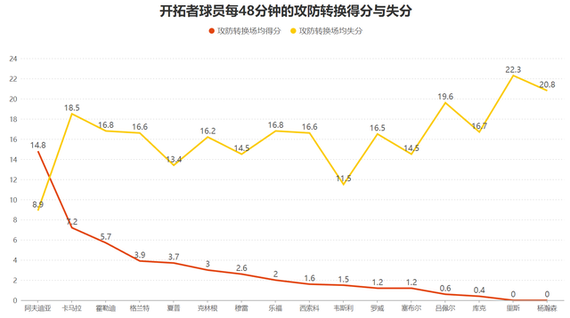 其二是杨瀚森的运动能力,这一点也是限制他最大的因素,杨瀚森目前为止在攻防转换方面的得分数为零,这意味着他没有任何反击与快攻得分,反而当他在场时开拓者每48分钟的攻防转换失分达到了20.8分,这意味着杨瀚森的在场会令开拓者的陷入更慢的攻防状态,而他在场时的攻防转换失分也仅少于库克,当然,库克的总出场时间比杨瀚森还要少。