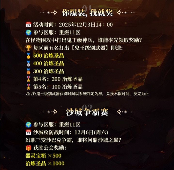 爆装就领奖:12月3日起,打出【鬼王级武器】的全区前五名,最高领500个冶炼圣晶,开局资源直接拉满;
